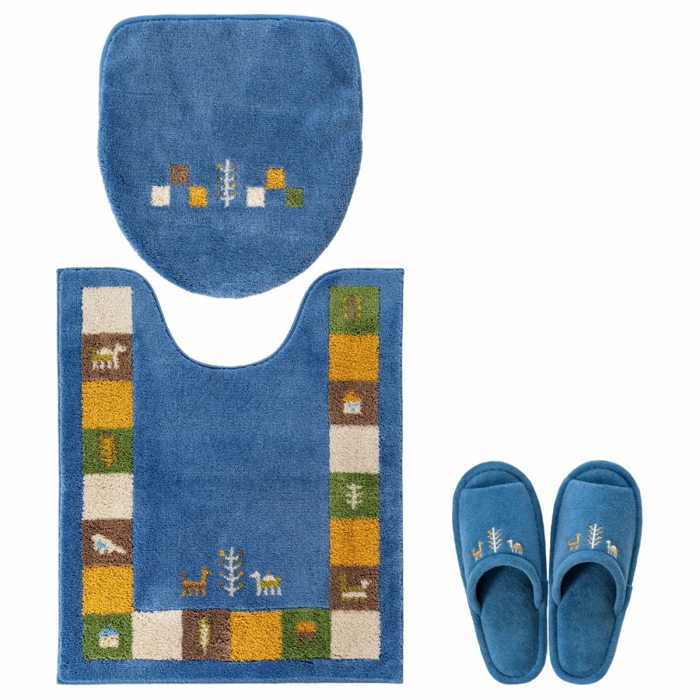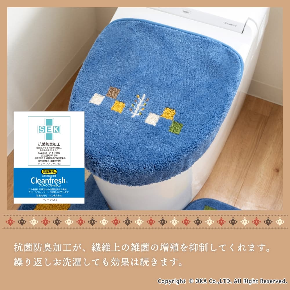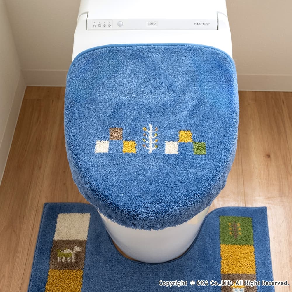 トイレマットとフタカバーは、繊細な柄が表現でき、毛立ちがいい、日本製のウィルトン織りでできています。どのアイテムも洗濯ネットに入れて丸洗いできるので、お手入れが簡単です。空をイメージしたブルー、自然の大地をイメージしたベージュで、トイレ空間をエスニックテイストで彩ってくれます。