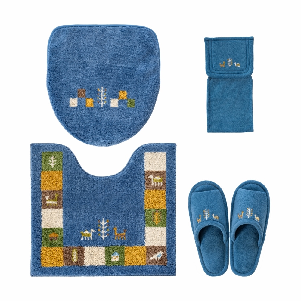 トイレマットとフタカバーは、繊細な柄が表現でき、毛立ちがいい、日本製のウィルトン織りでできています。どのアイテムも洗濯ネットに入れて丸洗いできるので、お手入れが簡単です。空をイメージしたブルー、自然の大地をイメージしたベージュで、トイレ空間をエスニックテイストで彩ってくれます。