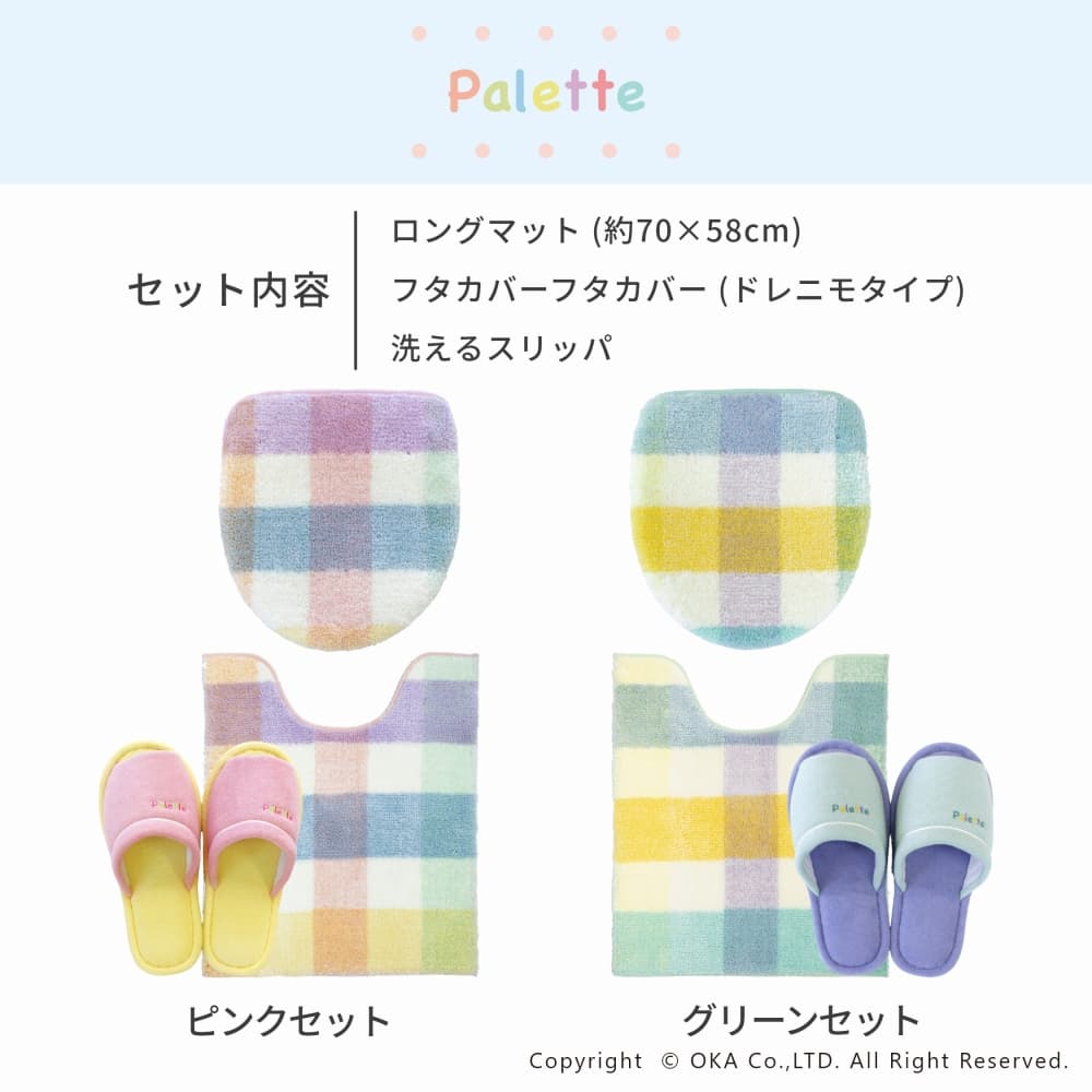 パレット トイレ3点セット ( ロングトイレマット+トイレフタカバー+スリッパ )(洗える 裏面すべり止め加工 チェック パステル ナチュラル 北欧 風水 )