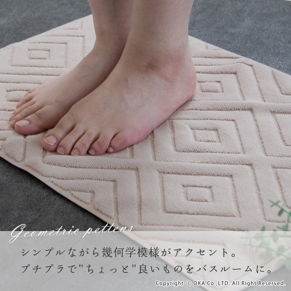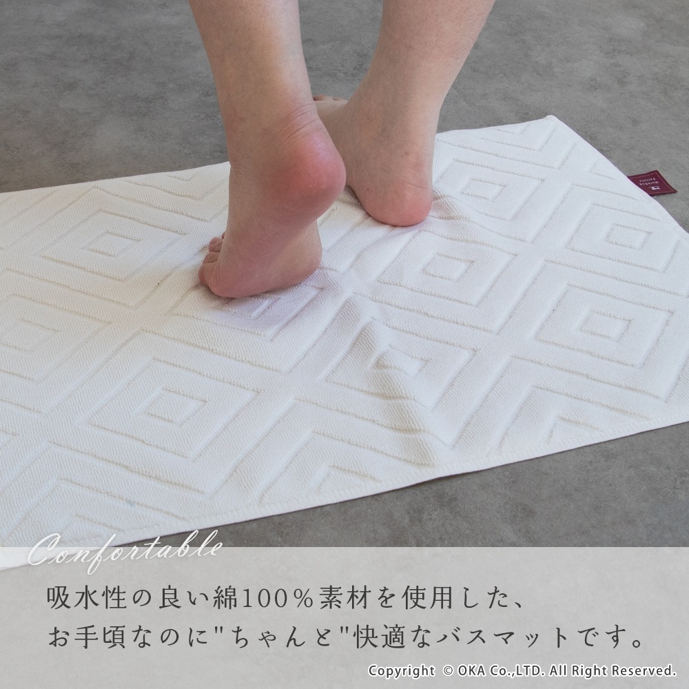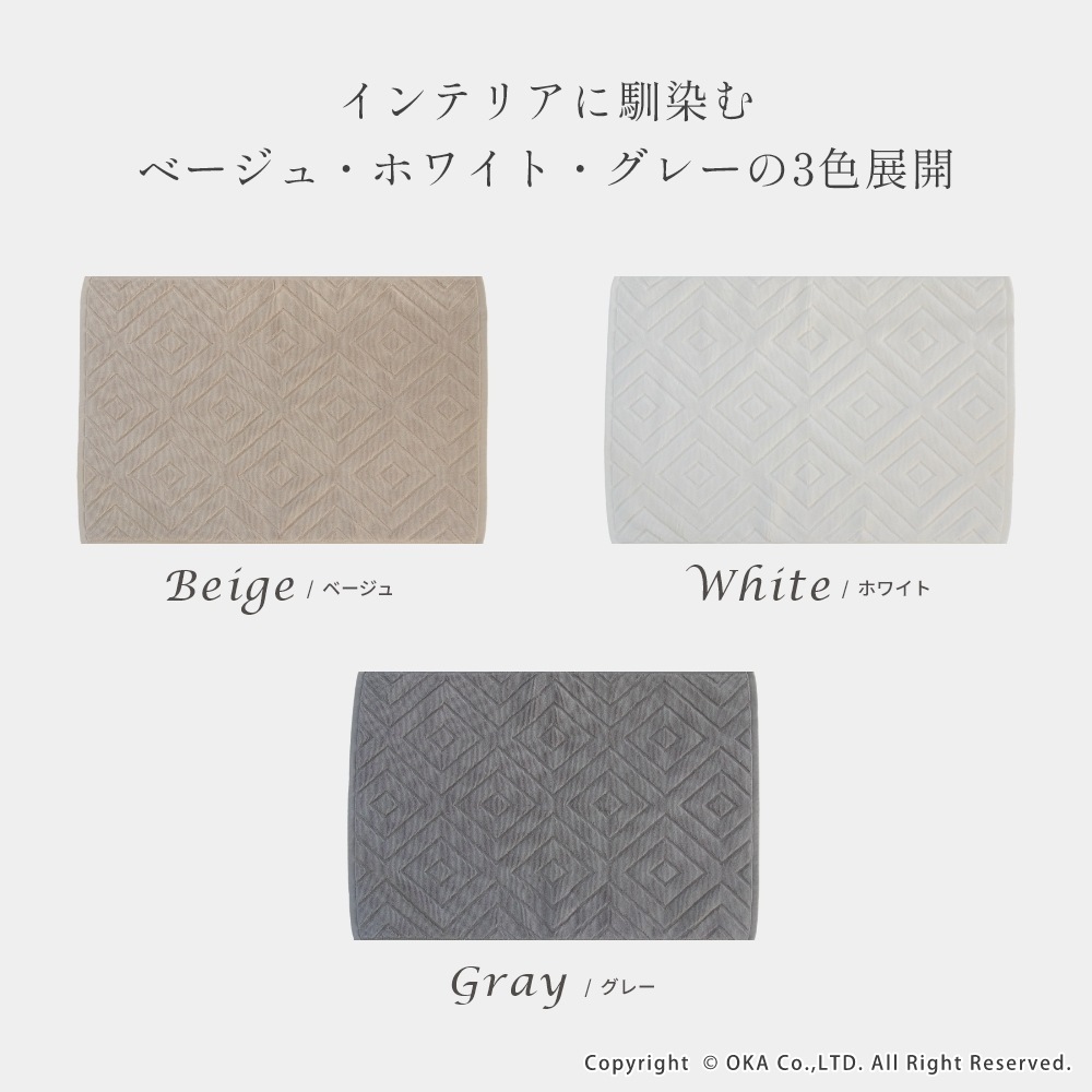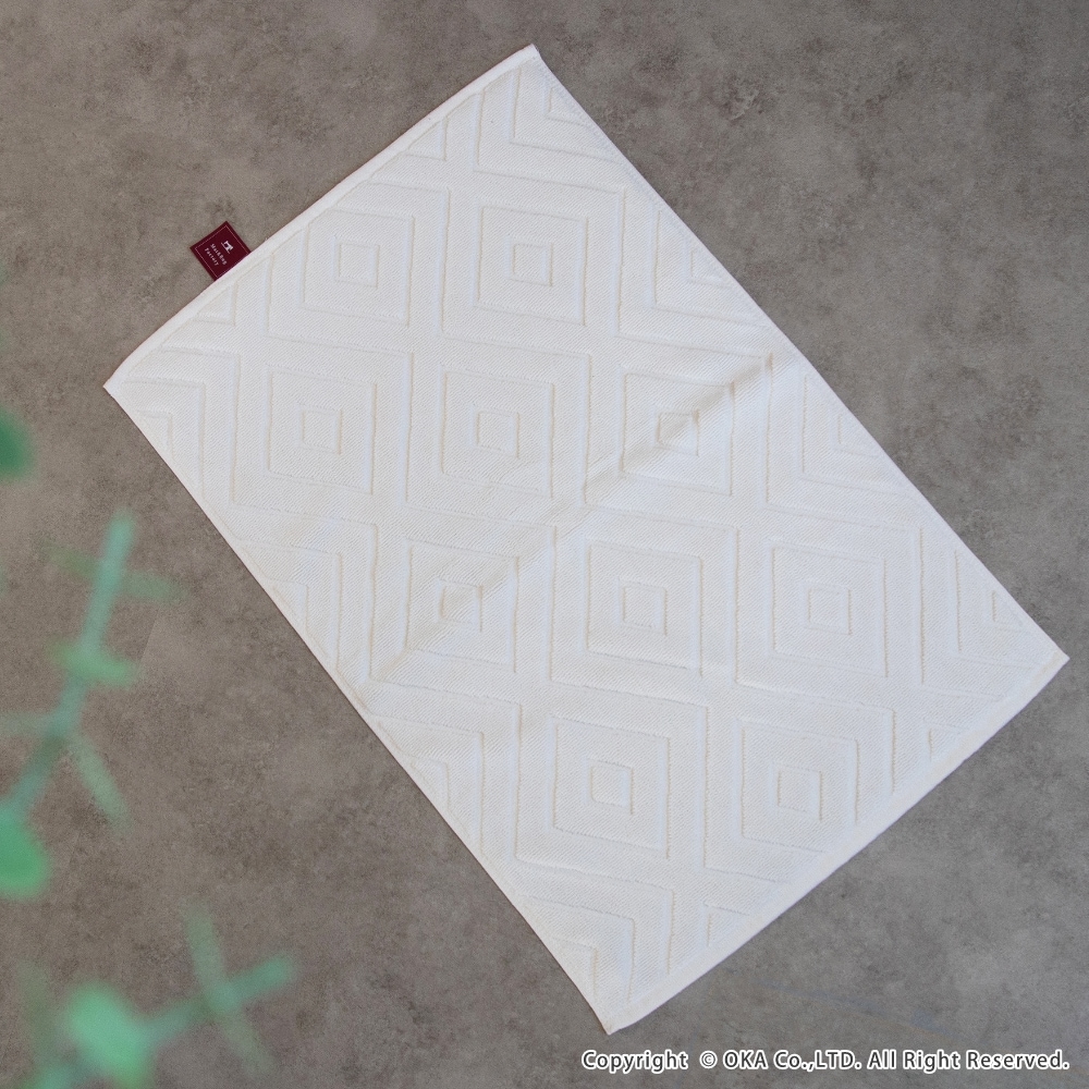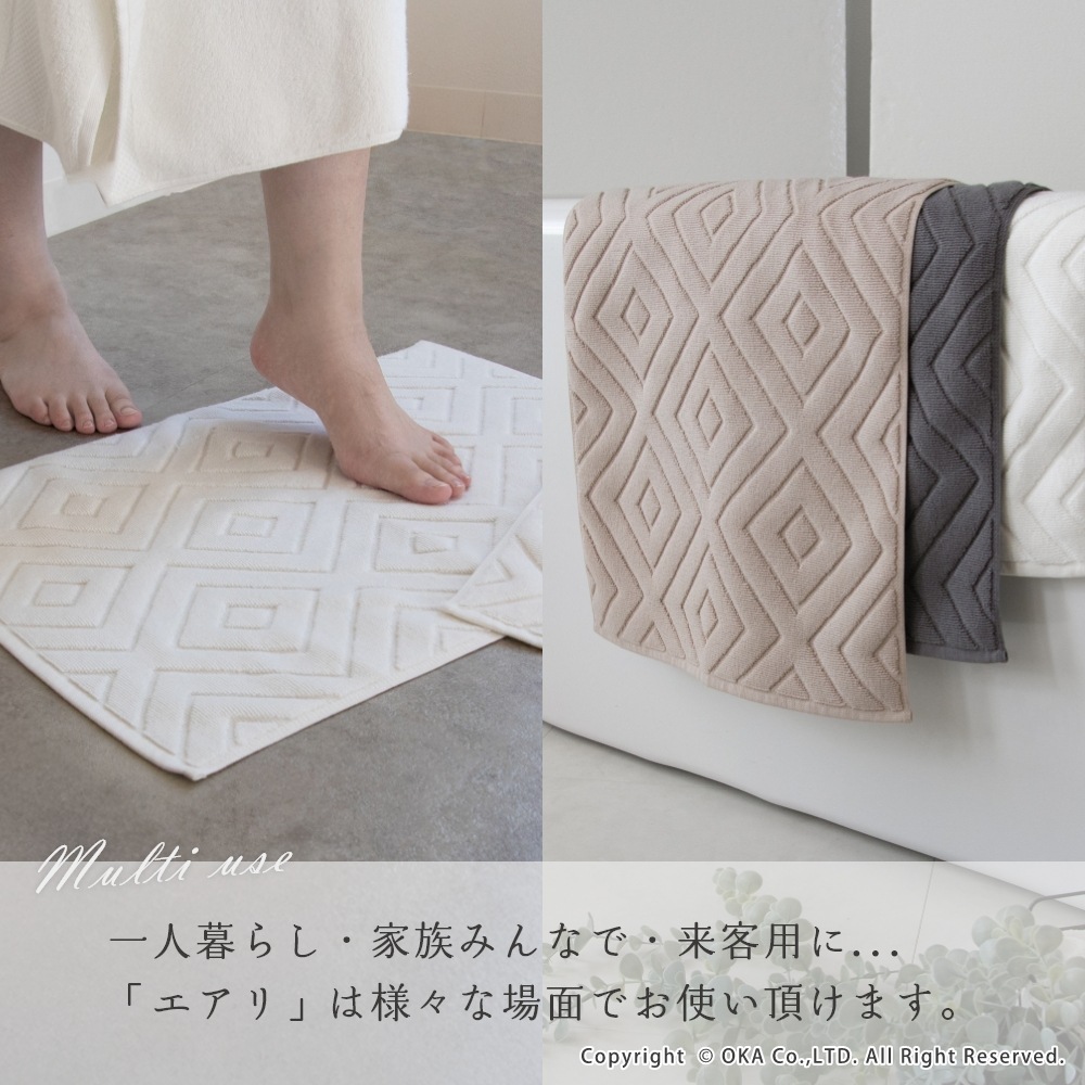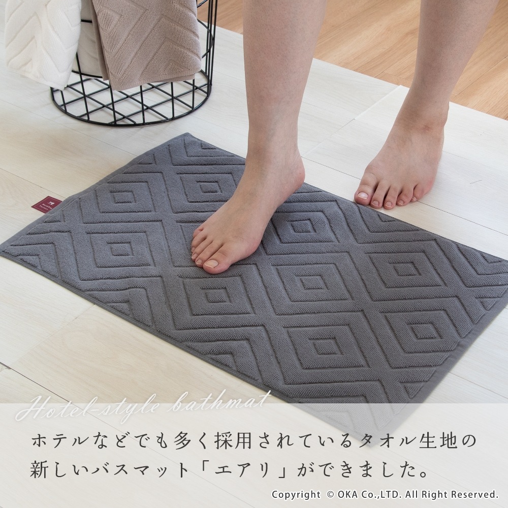 ホテルなどでも多く採用されているタオル生地に、ダイヤの幾何学模様をあしらったバスマット「エアリ」。シンプルなデザインながら、バスルームをさりげなく上品な雰囲気に見せてくれます。乾燥機にもかけることができて毎日気軽にお洗濯していただけます。吸水性が良くしっかりと乾く綿100%素材を使用しています。タオル生地なので小さく折り畳めて収納場所にも困りません。お求めやすい価格で一人暮らしの方はもちろん、複数枚揃えて家族での使い分けや、来客用の予備など色々な場面でお使いいただけます。無料簡易ラッピングにも対応しておりプチギフトにもおすすめです!