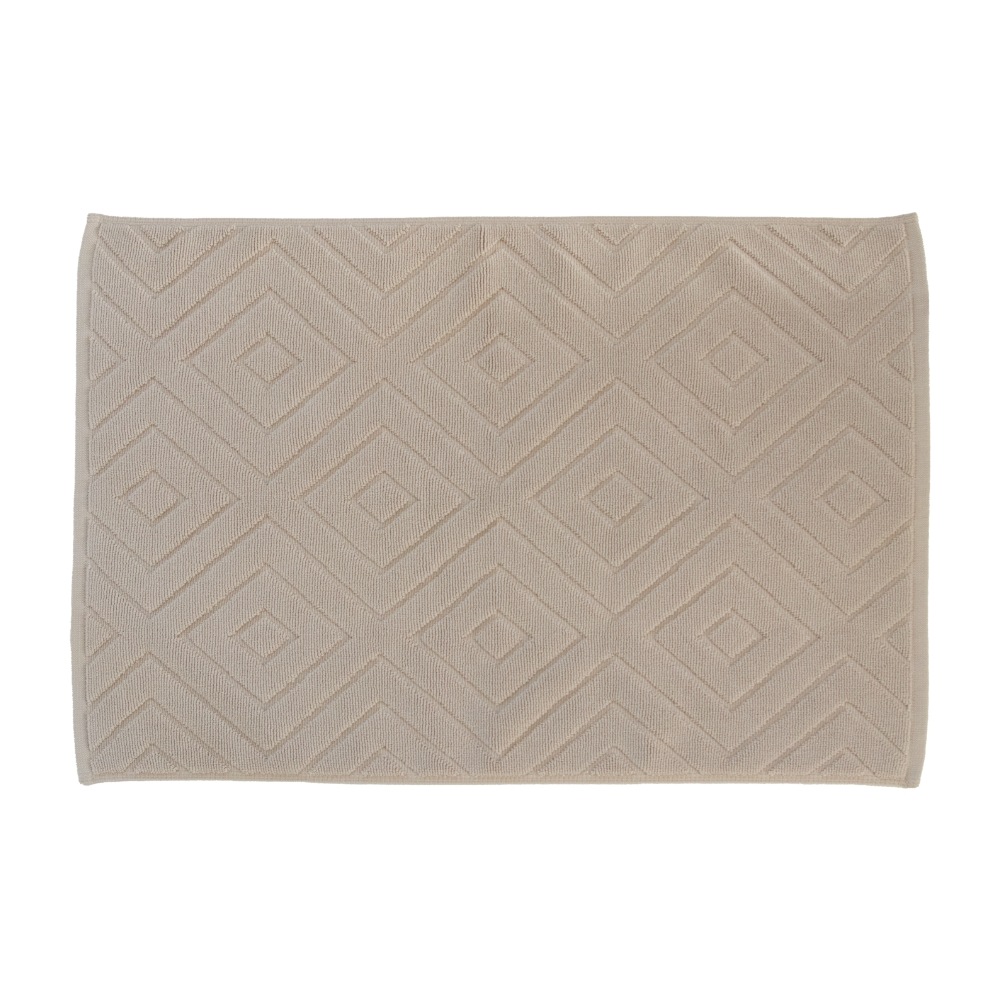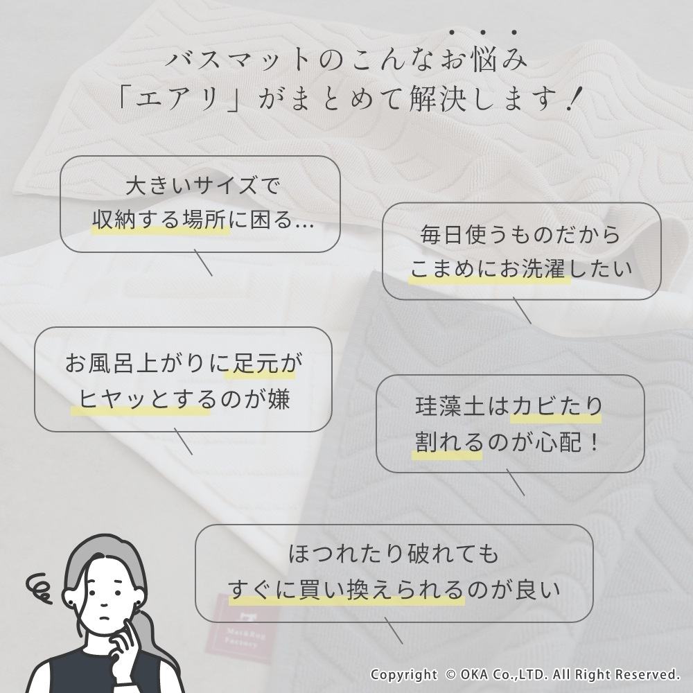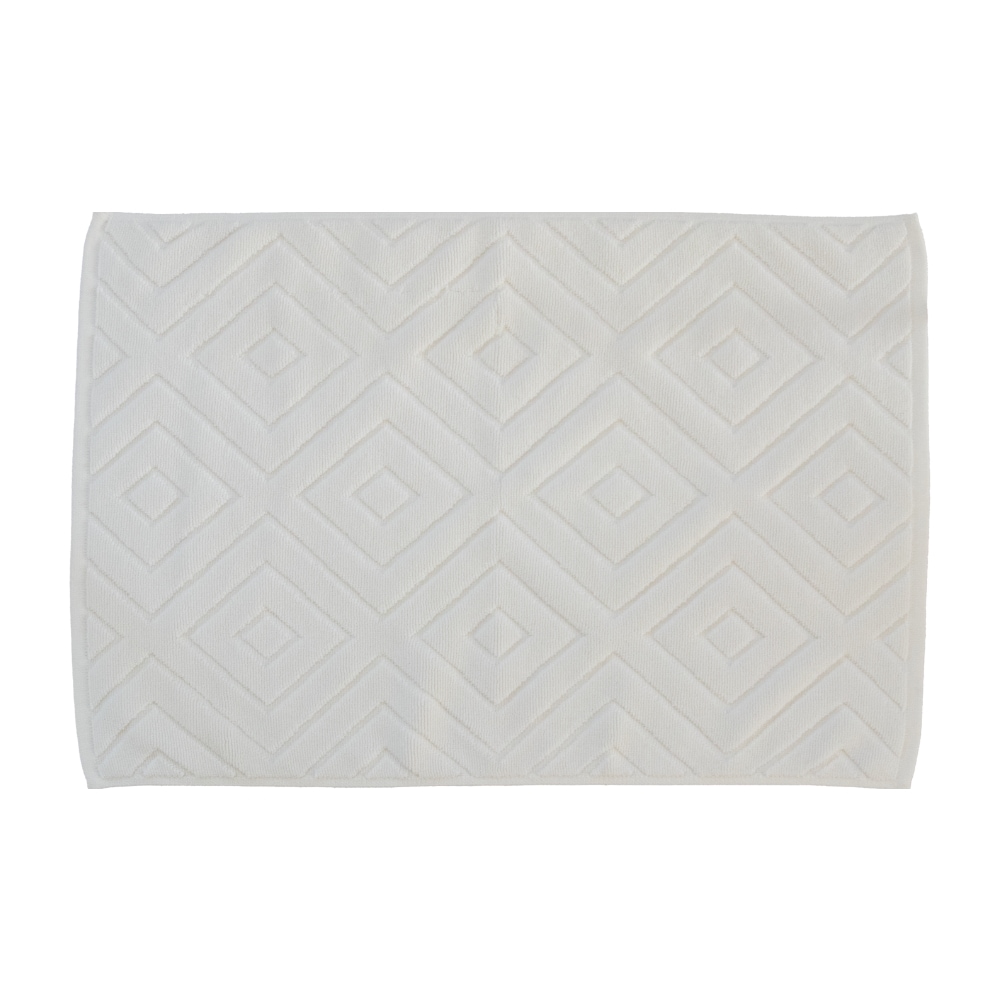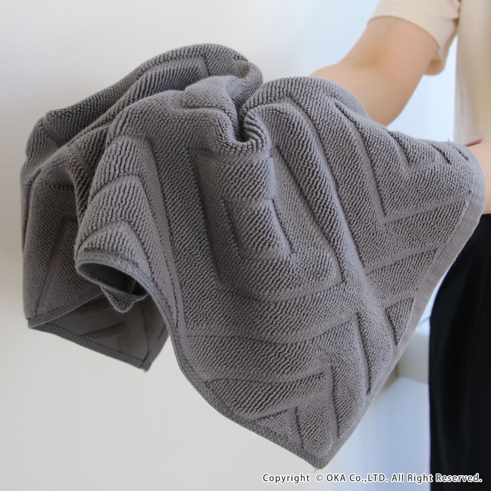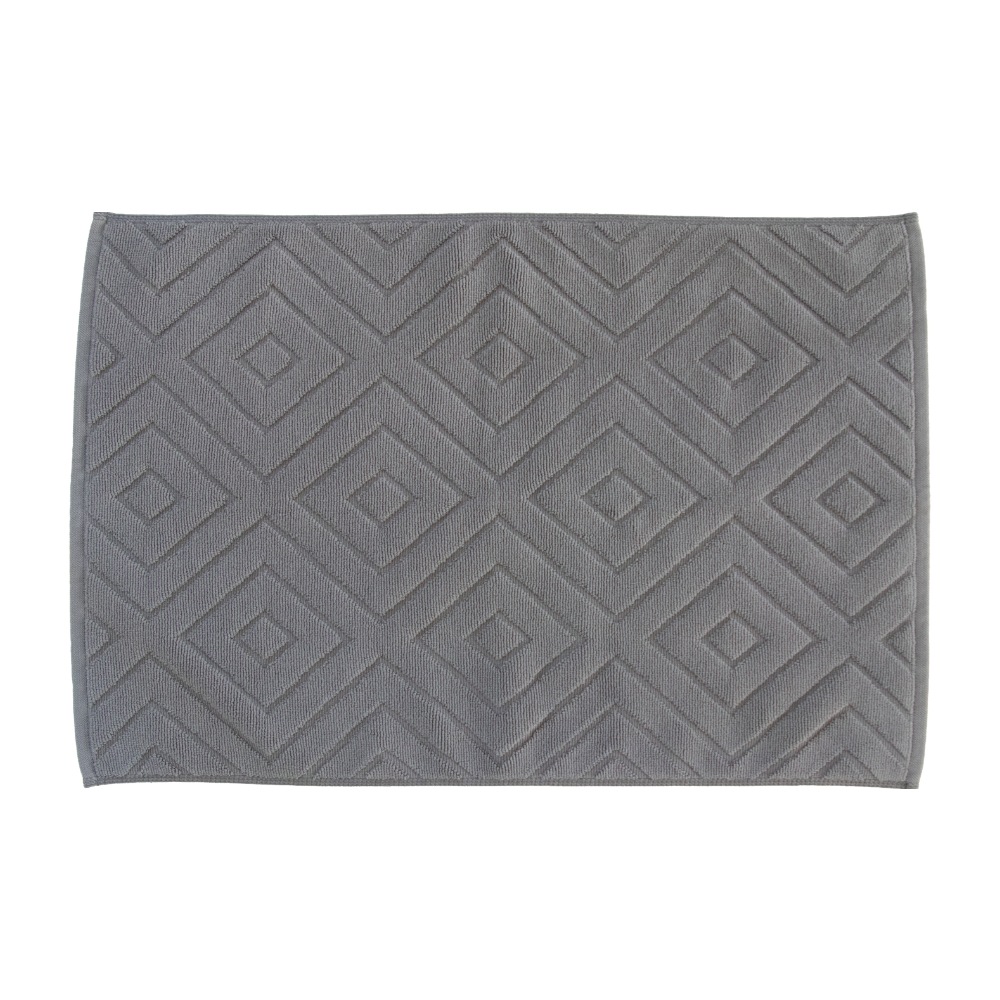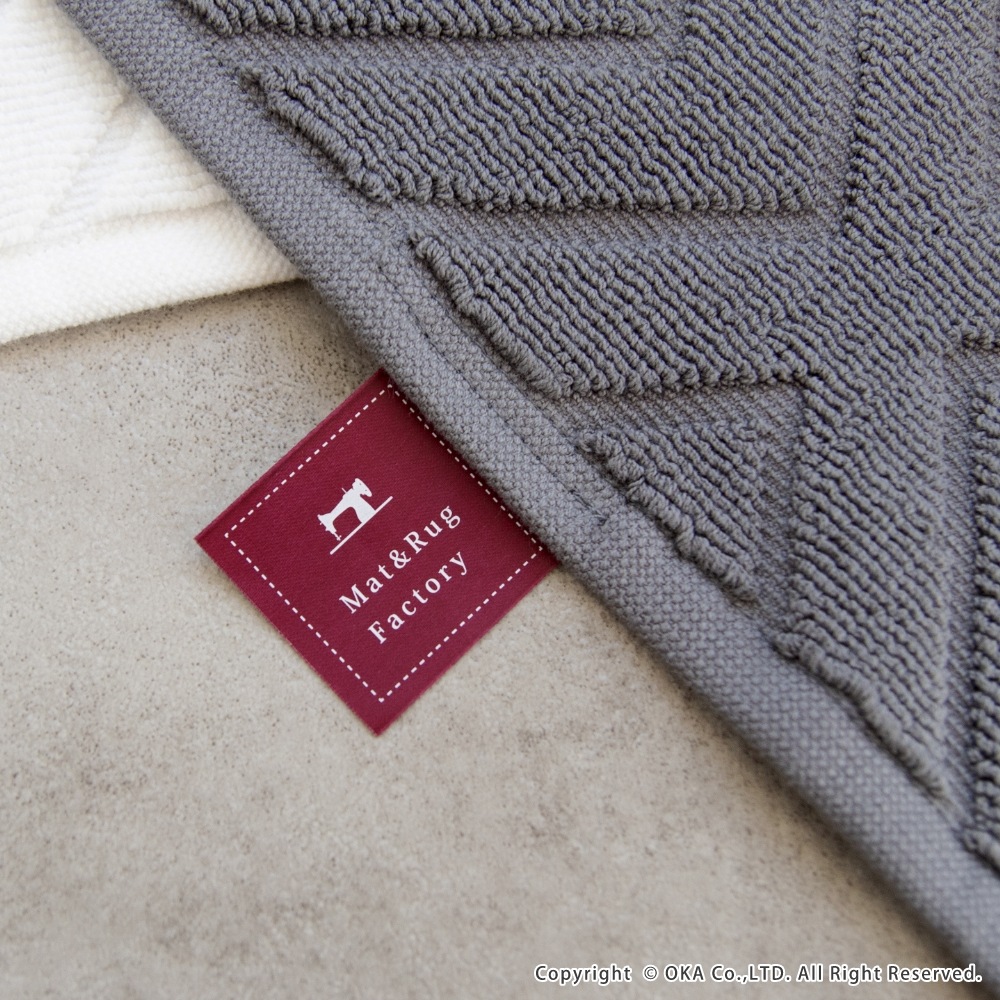 ホテルなどでも多く採用されているタオル生地に、ダイヤの幾何学模様をあしらったバスマット「エアリ」。シンプルなデザインながら、バスルームをさりげなく上品な雰囲気に見せてくれます。乾燥機にもかけることができて毎日気軽にお洗濯していただけます。吸水性が良くしっかりと乾く綿100%素材を使用しています。タオル生地なので小さく折り畳めて収納場所にも困りません。お求めやすい価格で一人暮らしの方はもちろん、複数枚揃えて家族での使い分けや、来客用の予備など色々な場面でお使いいただけます。無料簡易ラッピングにも対応しておりプチギフトにもおすすめです!
