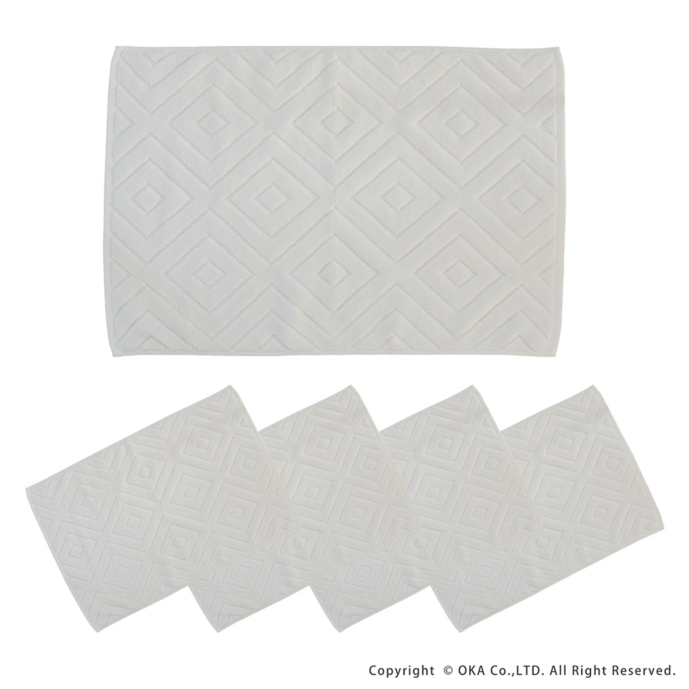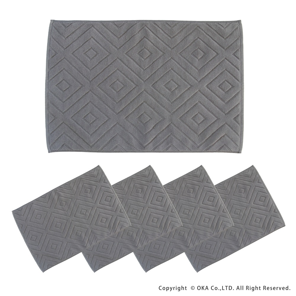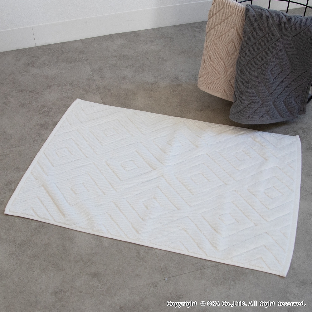 【お得な同色5枚組セット!】ホテルなどでも多く採用されているタオル生地に、ダイヤの幾何学模様をあしらったバスマット「エアリ」。シンプルなデザインながら、バスルームをさりげなく上品な雰囲気に見せてくれます。乾燥機にもかけることができて毎日気軽にお洗濯していただけます。吸水性が良くしっかりと乾く綿100%素材を使用しています。タオル生地なので小さく折り畳めて収納場所にも困りません。お求めやすい価格で一人暮らしの方はもちろん、複数枚揃えて家族での使い分けや、来客用の予備など色々な場面でお使いいただけます。無料簡易ラッピングにも対応しておりプチギフトにもおすすめです!