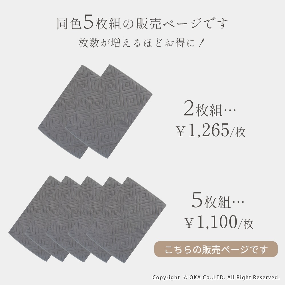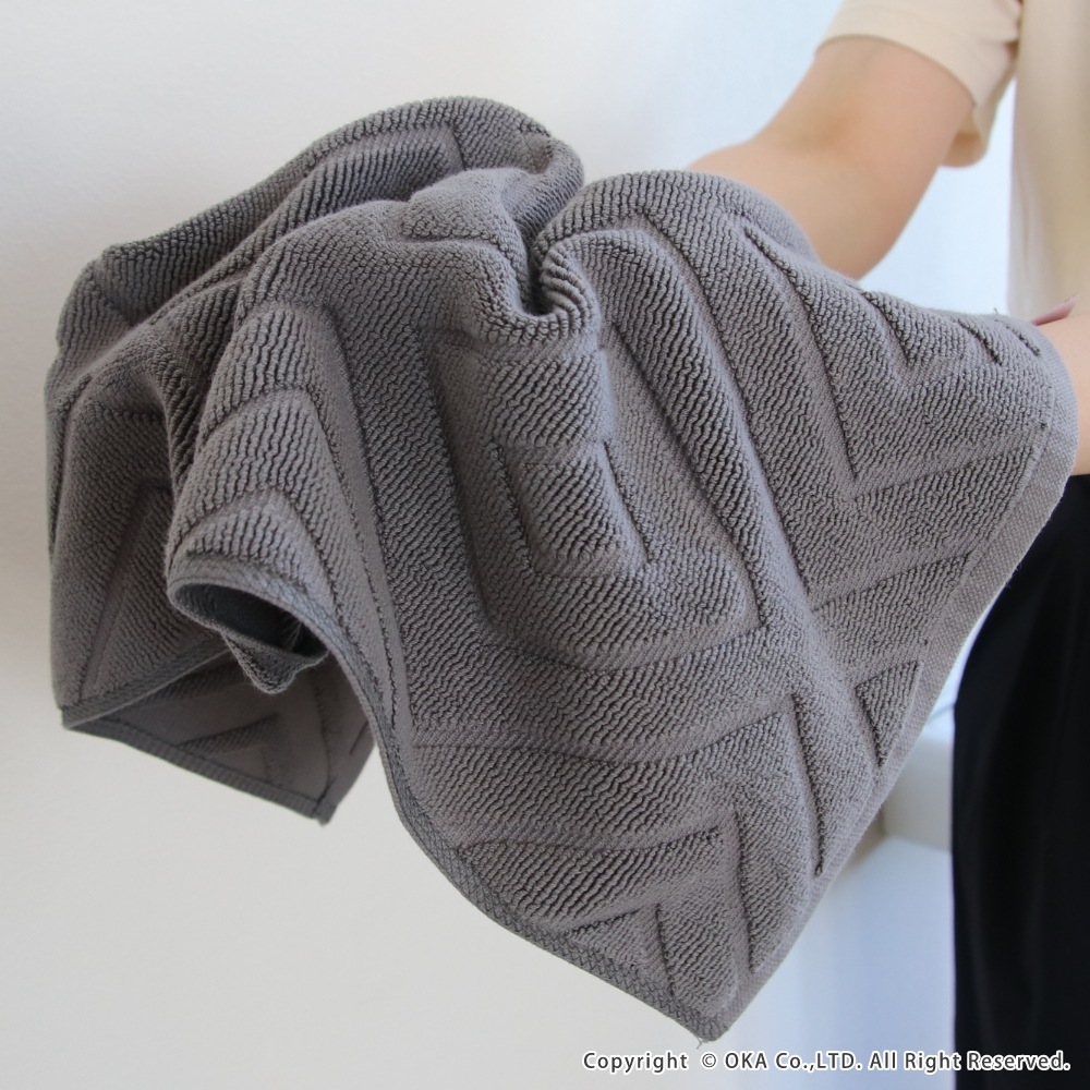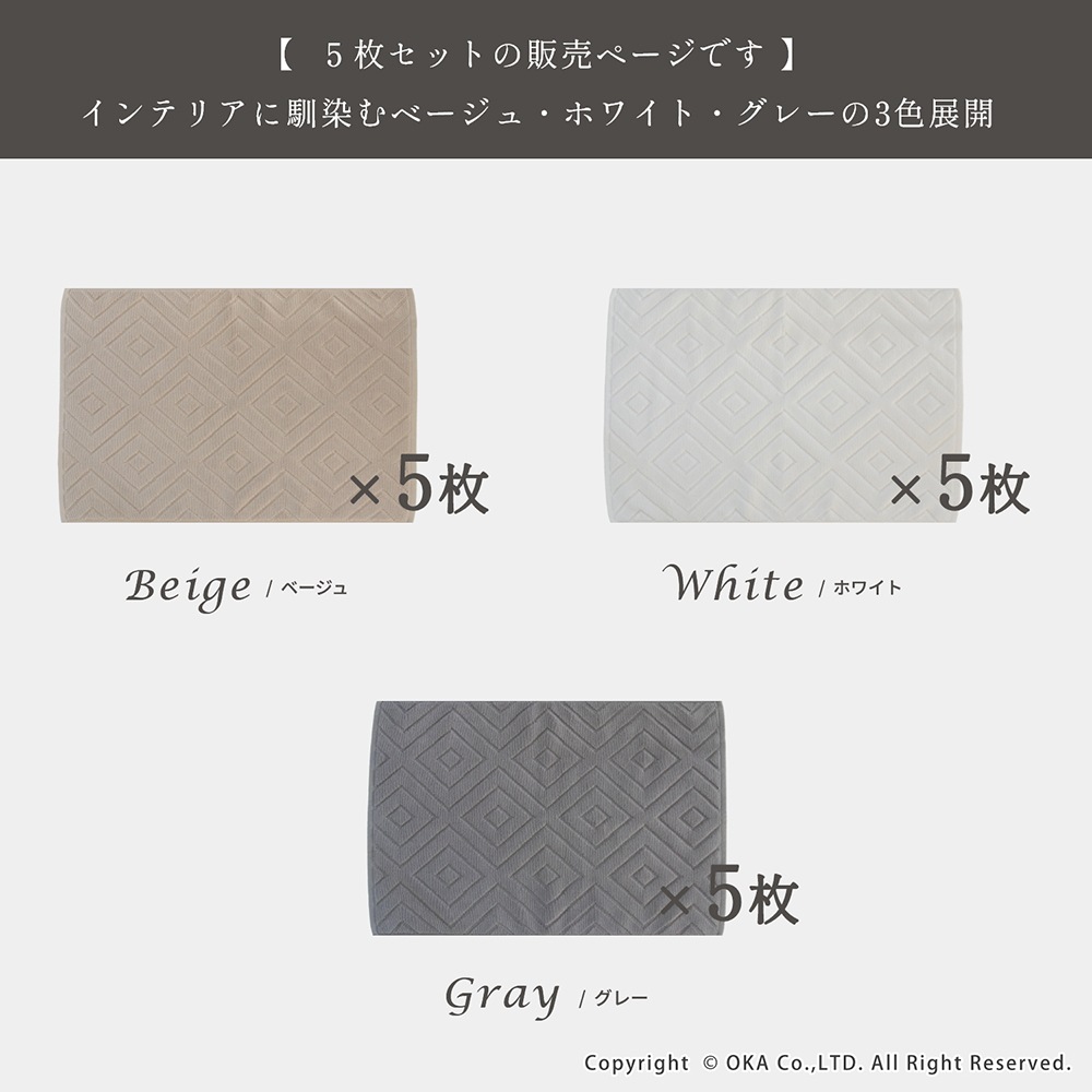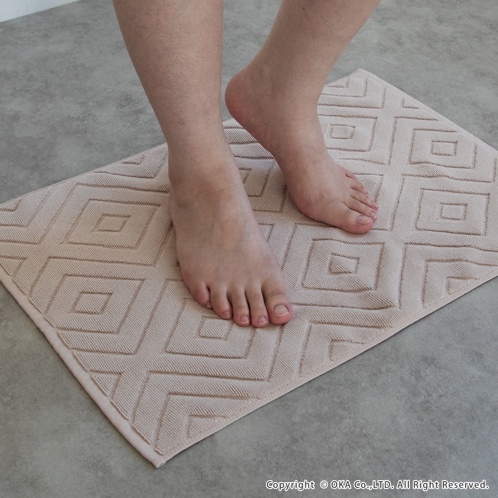【お得な同色5枚組セット!】ホテルなどでも多く採用されているタオル生地に、ダイヤの幾何学模様をあしらったバスマット「エアリ」。シンプルなデザインながら、バスルームをさりげなく上品な雰囲気に見せてくれます。乾燥機にもかけることができて毎日気軽にお洗濯していただけます。吸水性が良くしっかりと乾く綿100%素材を使用しています。タオル生地なので小さく折り畳めて収納場所にも困りません。お求めやすい価格で一人暮らしの方はもちろん、複数枚揃えて家族での使い分けや、来客用の予備など色々な場面でお使いいただけます。無料簡易ラッピングにも対応しておりプチギフトにもおすすめです!
