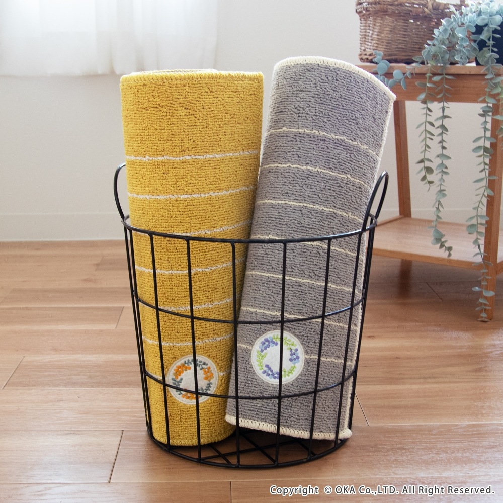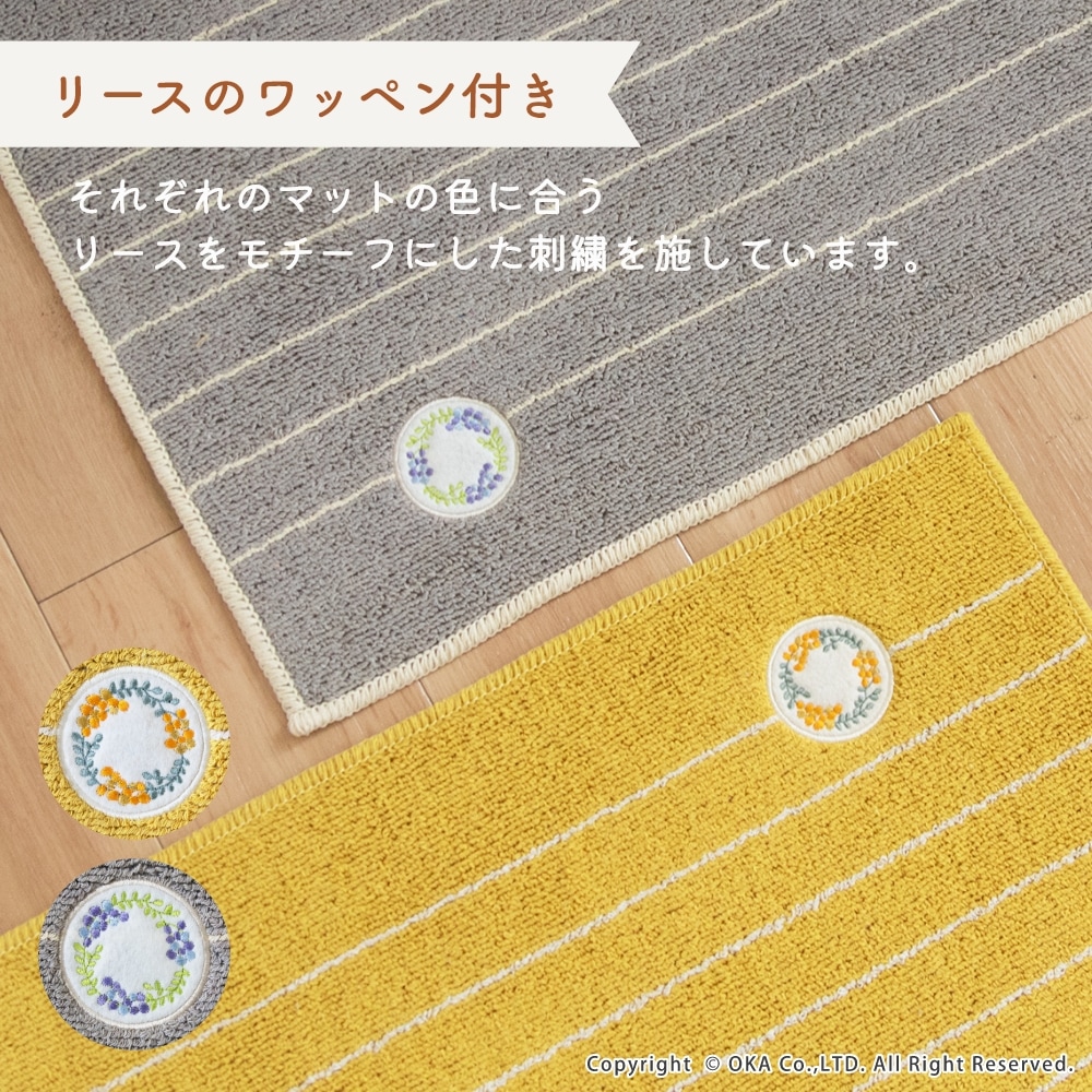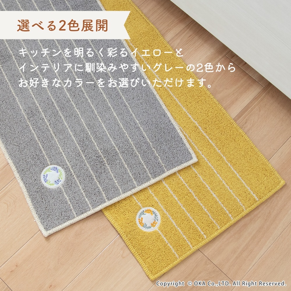 ミモザとベリー系の果物がモチーフの、可愛らしいリースのワッペンをあしらったキッチンマットです。キッチンを明るい印象にしてくれるイエローとインテリアに馴染みやすいグレーの2色展開で、しっかりとした色味なので汚れやすいキッチンでも気軽にお使いいただけます。裏面にはすべり止め加工を施しているためマットがずれにくく、細かいループ織で仕上げているので小さなくずなどが入り込むのを防ぎます。洗濯ネットに入れて洗濯機で丸洗いできお手入れが簡単です。見た目のかわいさだけではなく、キッチンでの使いやすさにもこだわりました。