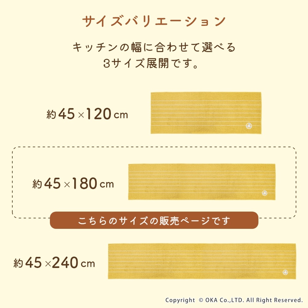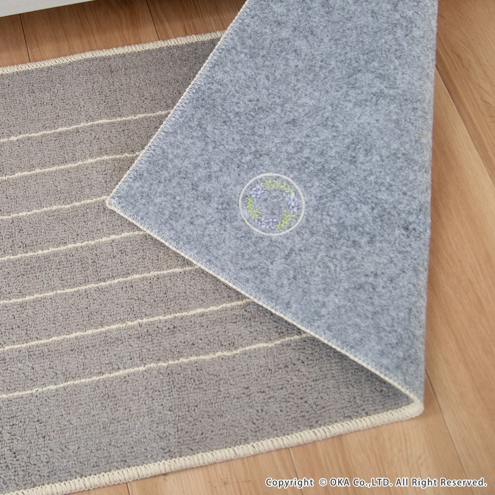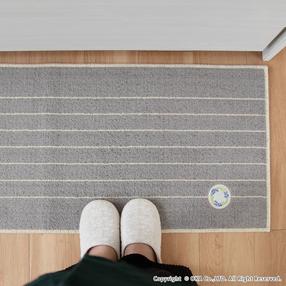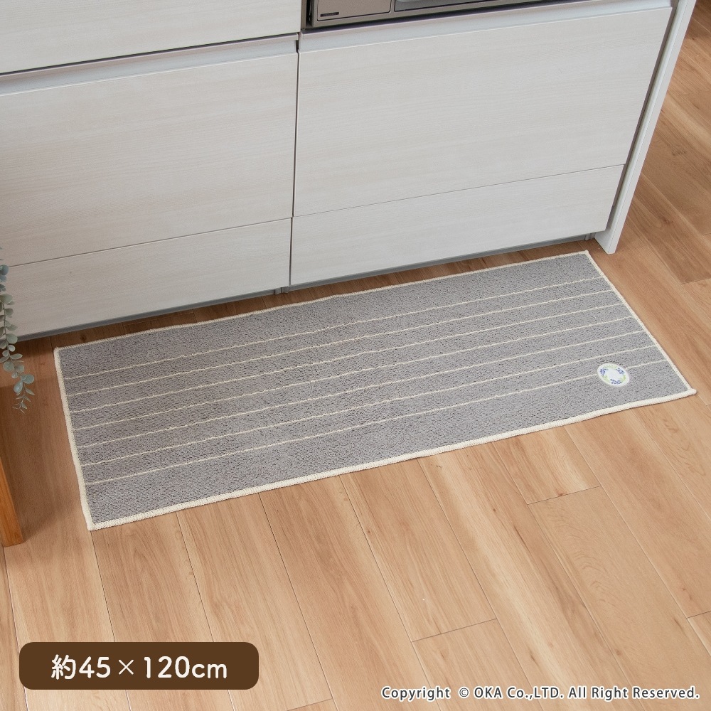 ミモザとベリー系の果物がモチーフの、可愛らしいリースのワッペンをあしらったキッチンマットです。キッチンを明るい印象にしてくれるイエローとインテリアに馴染みやすいグレーの2色展開で、しっかりとした色味なので汚れやすいキッチンでも気軽にお使いいただけます。裏面にはすべり止め加工を施しているためマットがずれにくく、細かいループ織で仕上げているので小さなくずなどが入り込むのを防ぎます。洗濯ネットに入れて洗濯機で丸洗いできお手入れが簡単です。見た目のかわいさだけではなく、キッチンでの使いやすさにもこだわりました。