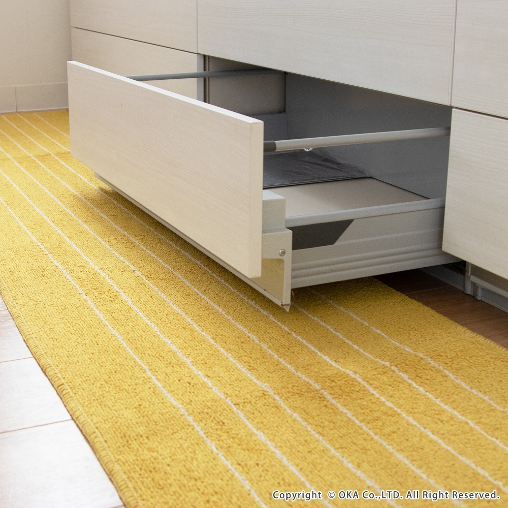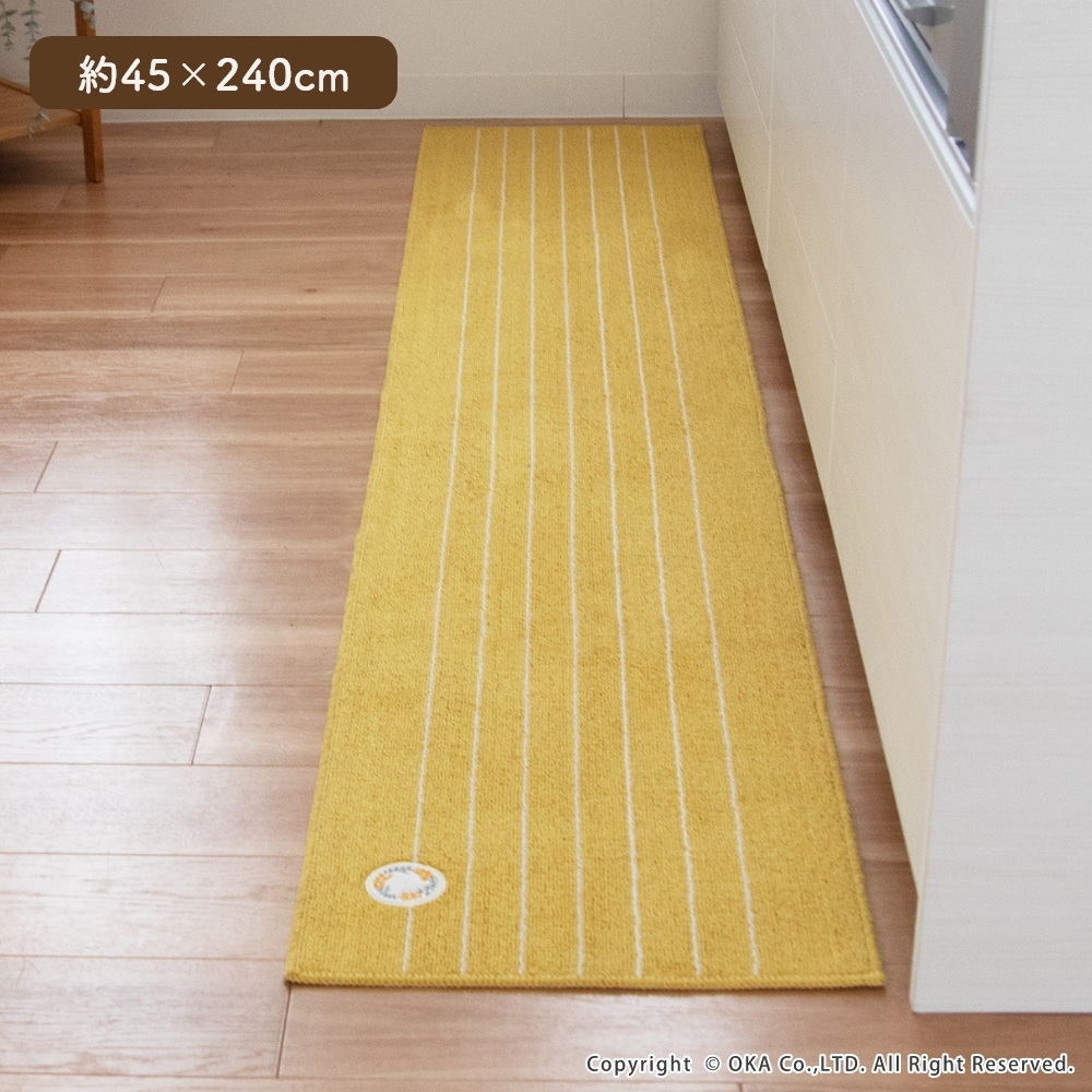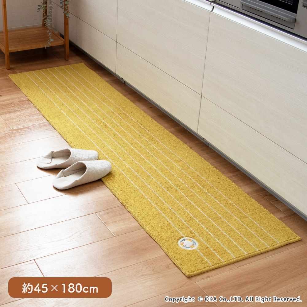 ミモザとベリー系の果物がモチーフの、可愛らしいリースのワッペンをあしらったキッチンマットです。キッチンを明るい印象にしてくれるイエローとインテリアに馴染みやすいグレーの2色展開で、しっかりとした色味なので汚れやすいキッチンでも気軽にお使いいただけます。裏面にはすべり止め加工を施しているためマットがずれにくく、細かいループ織で仕上げているので小さなくずなどが入り込むのを防ぎます。洗濯ネットに入れて洗濯機で丸洗いできお手入れが簡単です。見た目のかわいさだけではなく、キッチンでの使いやすさにもこだわりました。