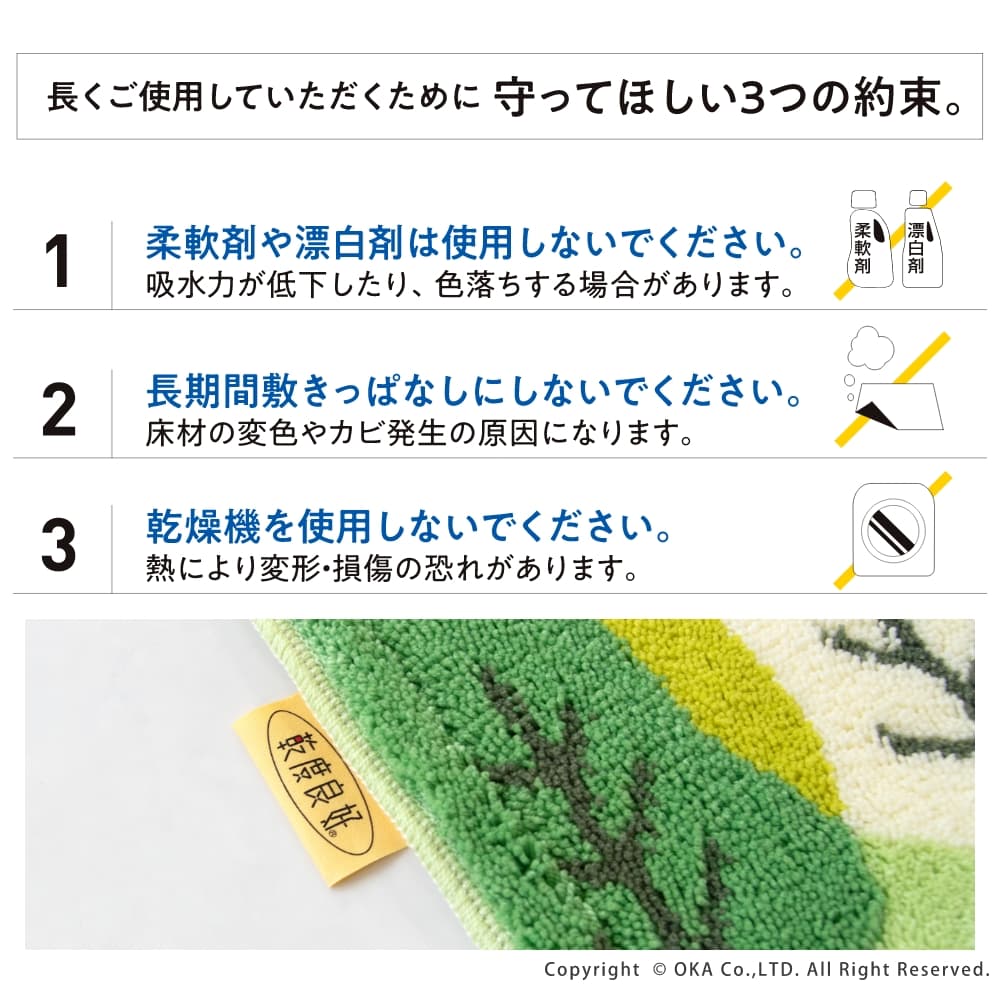 シリーズ販売30年以上続くロングセラー、乾度良好バスマットシリーズ。シンプルながらも抜け感のあるリーフ柄「乾度良好リーフダンス」が誕生しました。 濡れても濡れても、すぐ吸って乾くサラサラな乾度良好バスマットは温浴施設などでもご利用いただいている業務用バスマットとしても愛されています。 特殊構造繊維を使用しているので吸水速乾性に優れ、抗菌防臭加工付きでお風呂上がりを快適に迎えることができます。 また、日本製の丁寧に織り込まれたウィルトン織りで100回の洗濯後もその風合いは変わらず、耐久性にも優れています。 お風呂上がりのスッキリとした軽やかな気持ちに寄り添ってくれるデザインに仕上がっています。