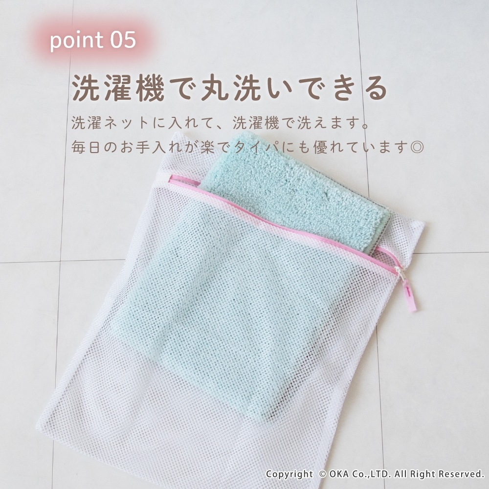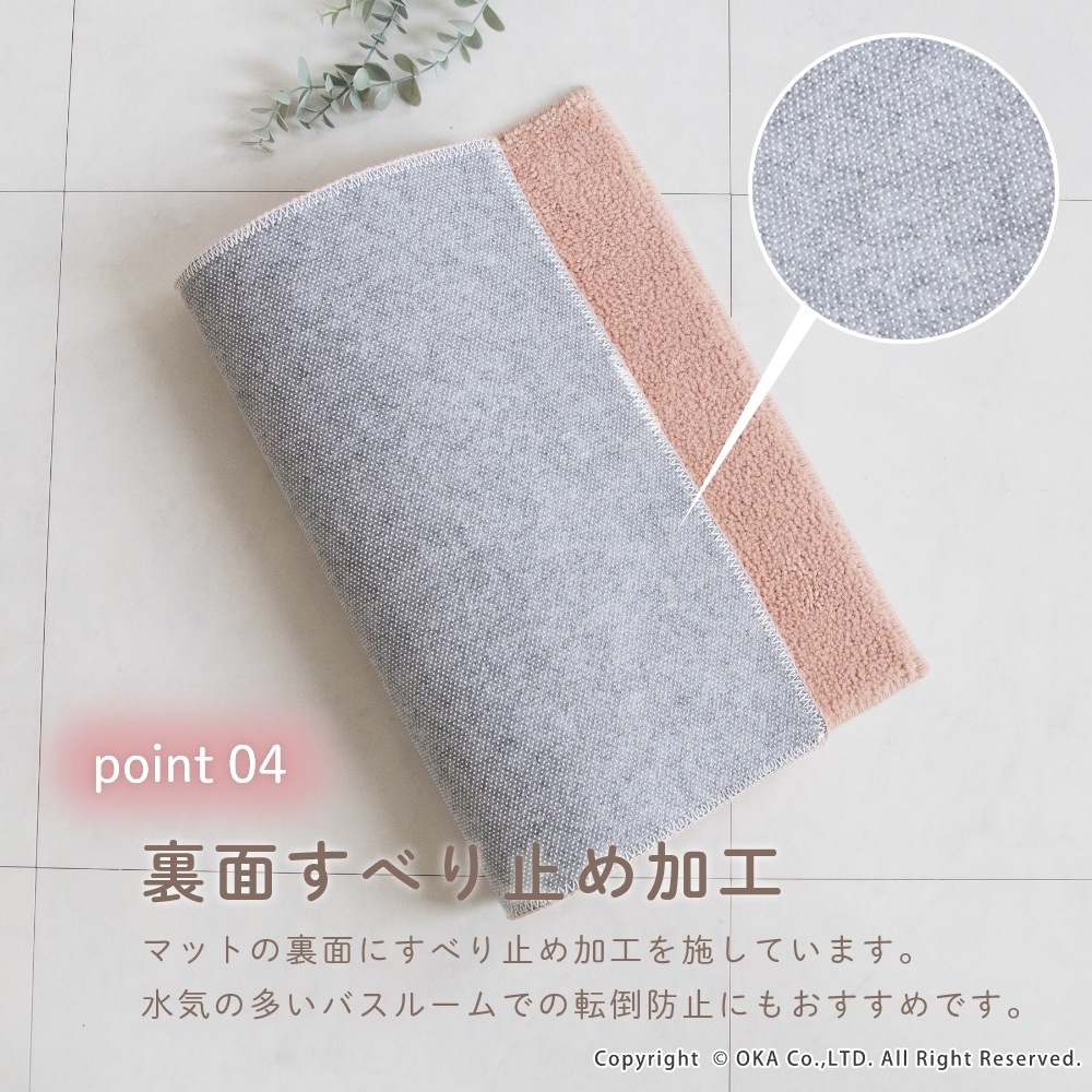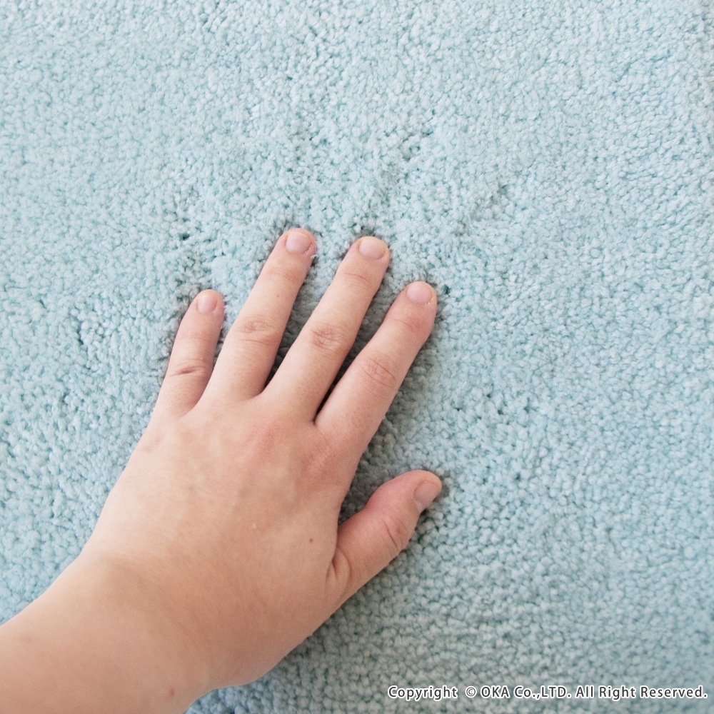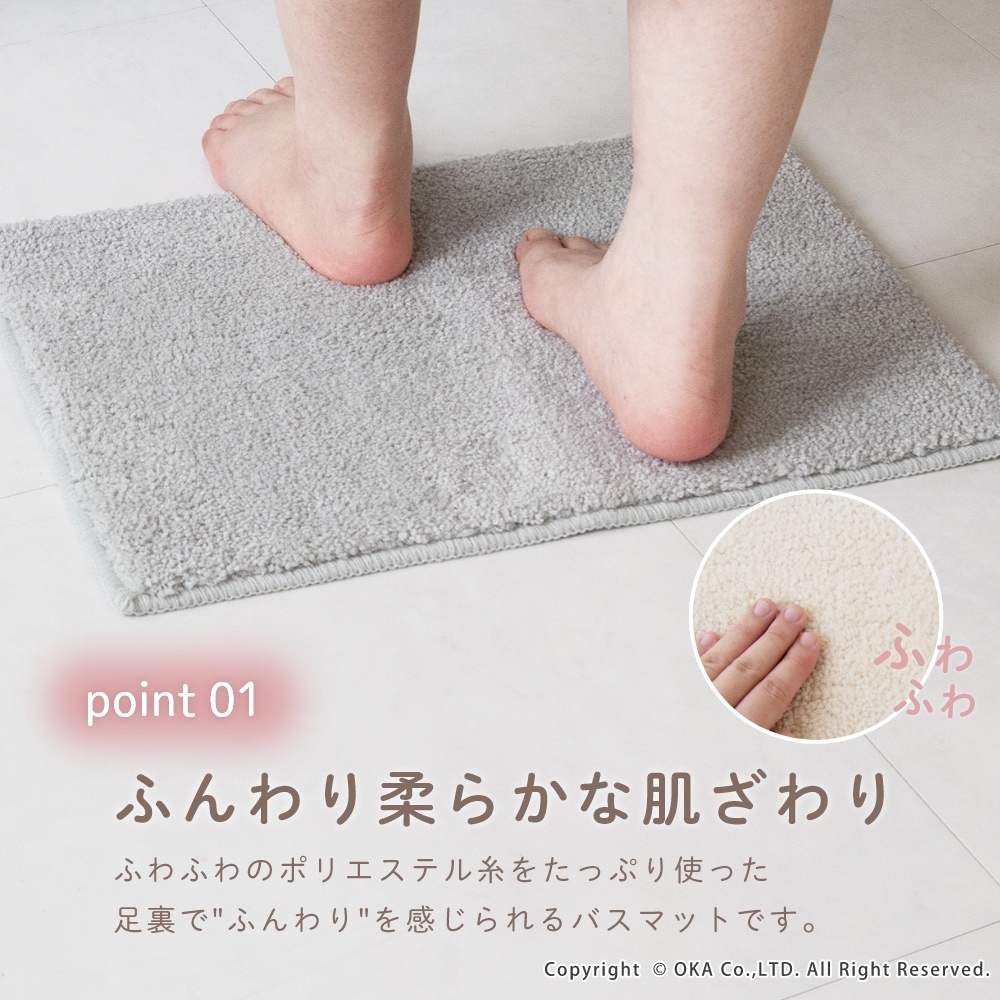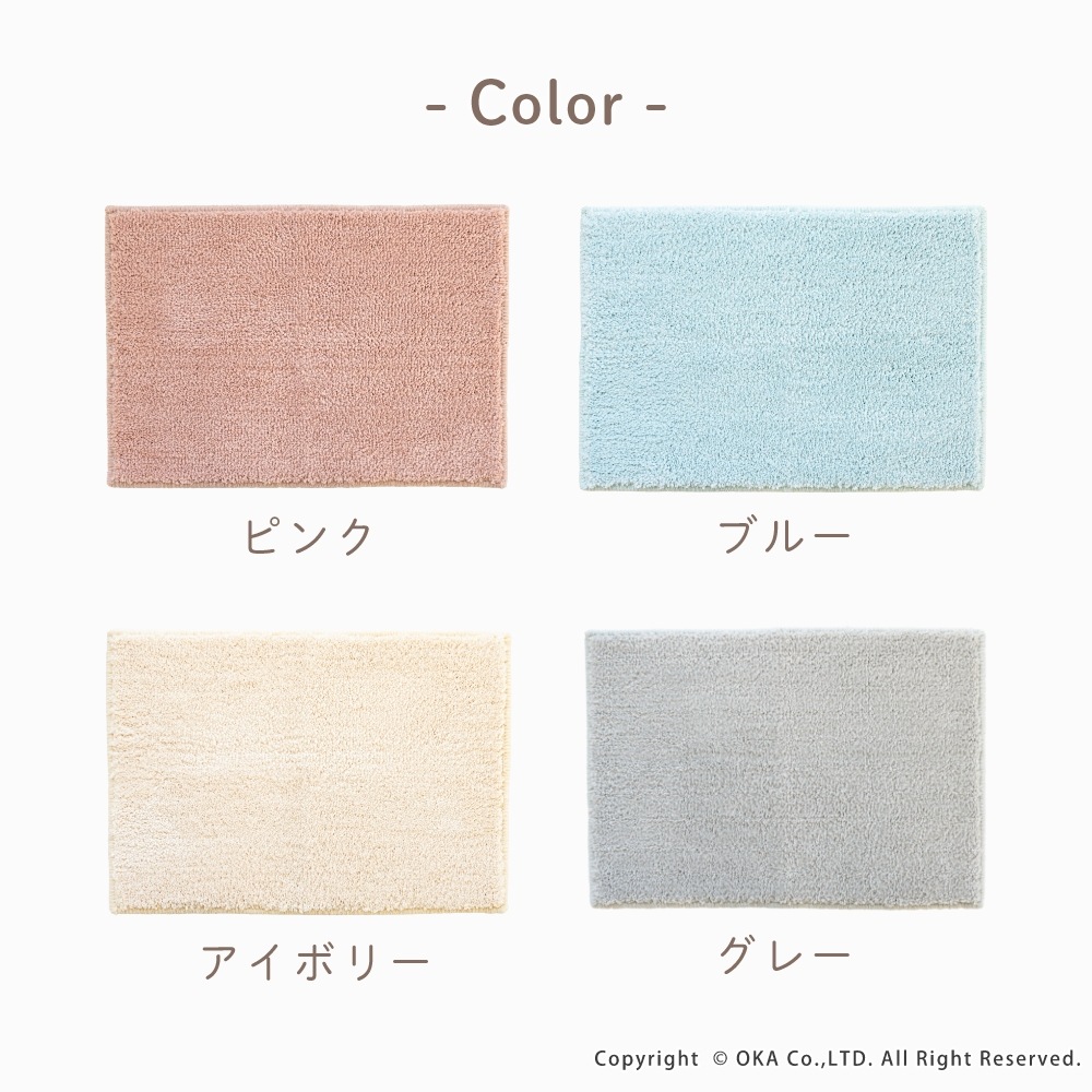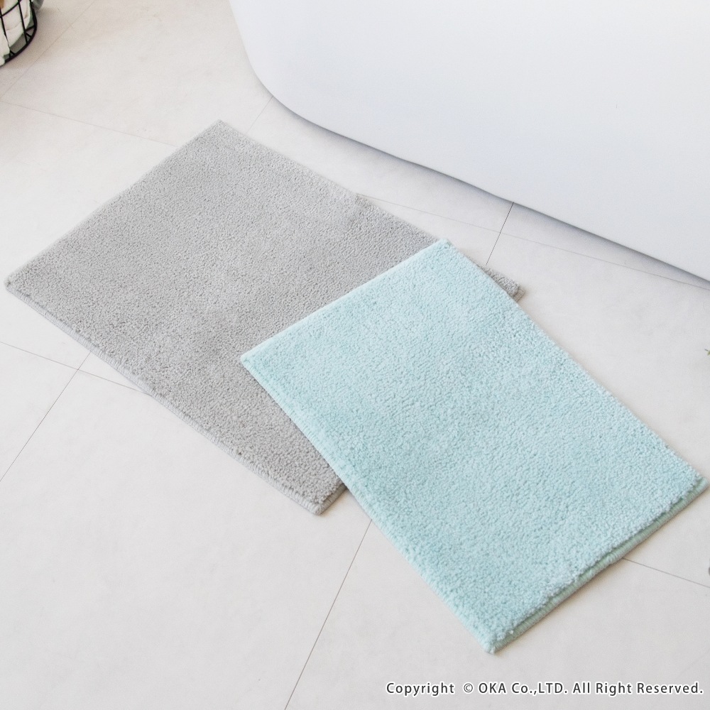 ふわふわのポリエステル糸をたっぷりと使い、フラット仕上げでどこを踏んでも足裏で「ふんわり」した踏み心地を感じられる、シンプルなバスマットです。優しい風合いにマッチする4色のパステルカラーからお選びいただけます。裏面にはすべり止め加工を施しており、滑りやすいバスルームでの転倒防止にもおすすめです。洗濯ネットに入れて洗濯機で丸洗い可能です。